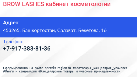 BROW & LASHES, кабинет косметологии по адресу 453265, Башкортостан, Салават, Бекетова, 16 в дальнейшем Организация, размещена в следующих категориях: