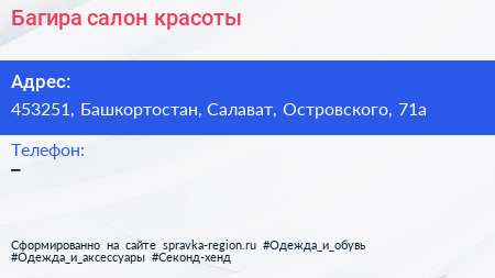 Багира, салон красоты по адресу 453251, Башкортостан, Салават, Островского, 71а в дальнейшем Организация, размещена в следующих категориях: