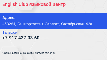 English Club, языковой центр по адресу 453264, Башкортостан, Салават, Октябрьская, 62а в дальнейшем Организация, размещена в следующих категориях: