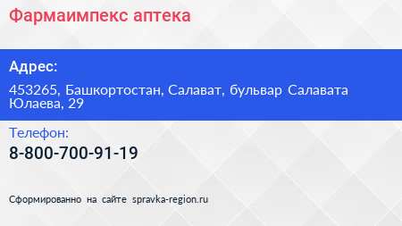 Фармаимпекс, аптека по адресу 453265, Башкортостан, Салават, бульвар Салавата Юлаева, 29 в дальнейшем Организация, размещена в следующих категориях: