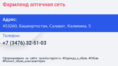 Фармленд, аптечная сеть по адресу 453260, Башкортостан, Салават, Калинина, 5 в дальнейшем Организация, размещена в следующих категориях: