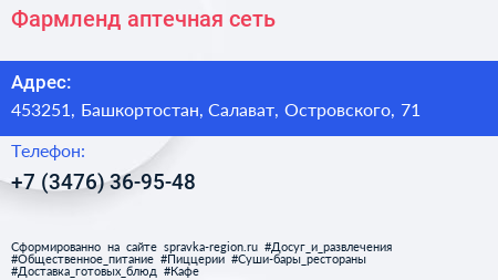 Фармленд, аптечная сеть по адресу 453251, Башкортостан, Салават, Островского, 71 в дальнейшем Организация, размещена в следующих категориях: