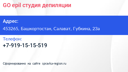 GO epil, студия депиляции по адресу 453265, Башкортостан, Салават, Губкина, 23а в дальнейшем Организация, размещена в следующих категориях: