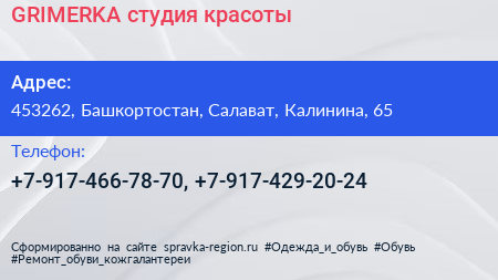 GRIMERKA, студия красоты по адресу 453262, Башкортостан, Салават, Калинина, 65 в дальнейшем Организация, размещена в следующих категориях:
