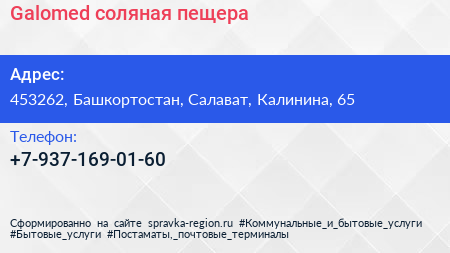Galomed, соляная пещера по адресу 453262, Башкортостан, Салават, Калинина, 65 в дальнейшем Организация, размещена в следующих категориях: