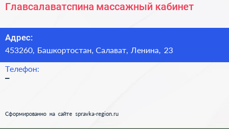 Главсалаватспина, массажный кабинет по адресу 453260, Башкортостан, Салават, Ленина, 23 в дальнейшем Организация, размещена в следующих категориях: