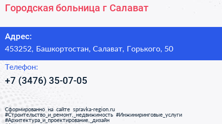 Городская больница г. Салават по адресу 453252, Башкортостан, Салават, Горького, 50 в дальнейшем Организация, размещена в следующих категориях: