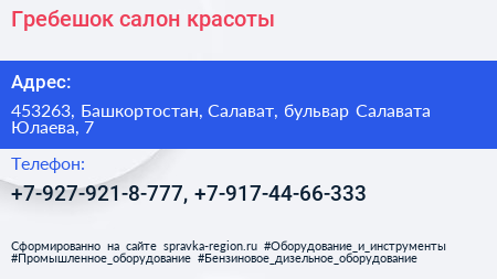 Гребешок, салон красоты по адресу 453263, Башкортостан, Салават, бульвар Салавата Юлаева, 7 в дальнейшем Организация, размещена в следующих категориях: