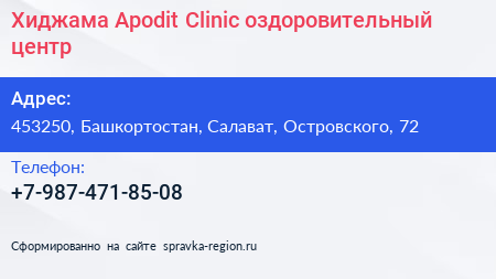 Хиджама Apodit Clinic, оздоровительный центр по адресу 453250, Башкортостан, Салават, Островского, 72 в дальнейшем Организация, размещена в следующих категориях: