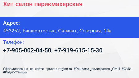 Хит, салон-парикмахерская по адресу 453252, Башкортостан, Салават, Северная, 14а в дальнейшем Организация, размещена в следующих категориях: