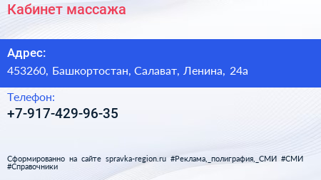 Кабинет массажа по адресу 453260, Башкортостан, Салават, Ленина, 24а в дальнейшем Организация, размещена в следующих категориях: