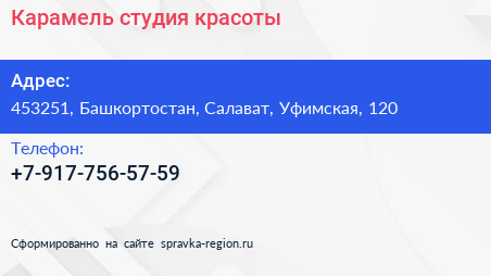Карамель, студия красоты по адресу 453251, Башкортостан, Салават, Уфимская, 120 в дальнейшем Организация, размещена в следующих категориях: