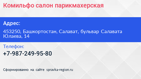 Комильфо, салон-парикмахерская по адресу 453250, Башкортостан, Салават, бульвар Салавата Юлаева, 14 в дальнейшем Организация, размещена в следующих категориях: