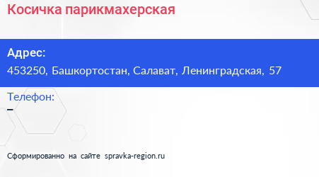 Косичка, парикмахерская по адресу 453250, Башкортостан, Салават, Ленинградская, 57 в дальнейшем Организация, размещена в следующих категориях: