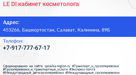 LE’DI, кабинет косметолога по адресу 453266, Башкортостан, Салават, Калинина, 89Б в дальнейшем Организация, размещена в следующих категориях: