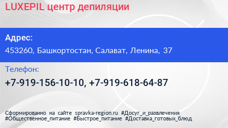 LUXEPIL, центр депиляции по адресу 453260, Башкортостан, Салават, Ленина, 37 в дальнейшем Организация, размещена в следующих категориях: