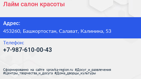 Лайм, салон красоты по адресу 453260, Башкортостан, Салават, Калинина, 53 в дальнейшем Организация, размещена в следующих категориях: