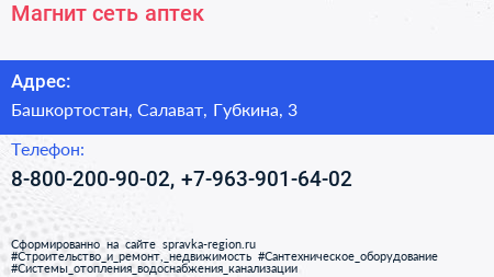 Магнит, сеть аптек по адресу Башкортостан, Салават, Губкина, 3 в дальнейшем Организация, размещена в следующих категориях:
