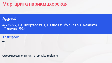 Маргарита, парикмахерская по адресу 453265, Башкортостан, Салават, бульвар Салавата Юлаева, 59а в дальнейшем Организация, размещена в следующих категориях: