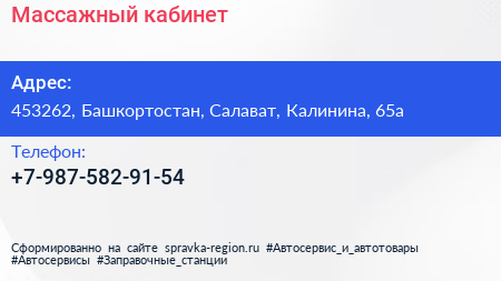 Массажный кабинет по адресу 453262, Башкортостан, Салават, Калинина, 65а в дальнейшем Организация, размещена в следующих категориях: