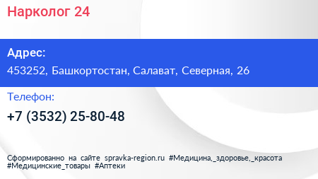 Нарколог 24+ по адресу 453252, Башкортостан, Салават, Северная, 26 в дальнейшем Организация, размещена в следующих категориях: