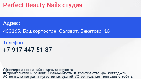 Perfect Beauty Nails, студия по адресу 453265, Башкортостан, Салават, Бекетова, 16 в дальнейшем Организация, размещена в следующих категориях:
