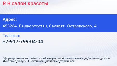 R & B, салон красоты по адресу 453264, Башкортостан, Салават, Островского, 4 в дальнейшем Организация, размещена в следующих категориях: