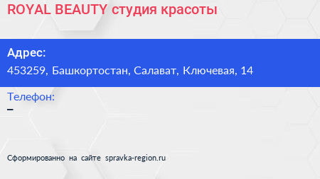 ROYAL BEAUTY, студия красоты по адресу 453259, Башкортостан, Салават, Ключевая, 14 в дальнейшем Организация, размещена в следующих категориях: