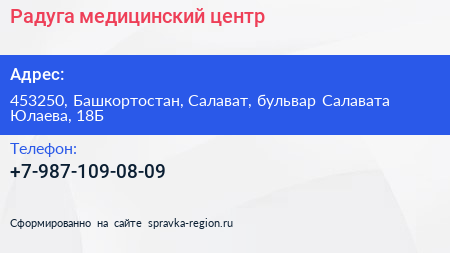 Радуга, медицинский центр по адресу 453250, Башкортостан, Салават, бульвар Салавата Юлаева, 18Б в дальнейшем Организация, размещена в следующих категориях: