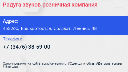 Радуга звуков, розничная компания по адресу 453260, Башкортостан, Салават, Ленина, 48 в дальнейшем Организация, размещена в следующих категориях: