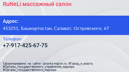 RuNeLi, массажный салон по адресу 453251, Башкортостан, Салават, Островского, 67 в дальнейшем Организация, размещена в следующих категориях: