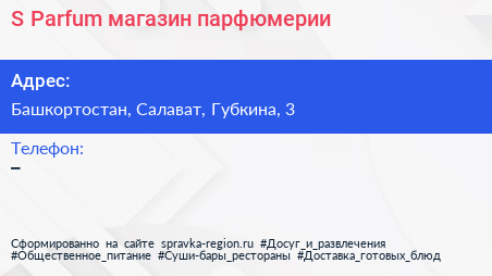 S-Parfum, магазин парфюмерии по адресу Башкортостан, Салават, Губкина, 3 в дальнейшем Организация, размещена в следующих категориях: