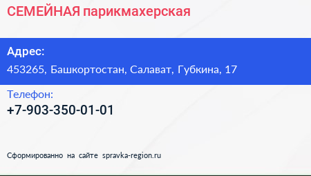 СЕМЕЙНАЯ, парикмахерская по адресу 453265, Башкортостан, Салават, Губкина, 17 в дальнейшем Организация, размещена в следующих категориях: