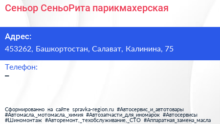 Сеньор - СеньоРита, парикмахерская по адресу 453262, Башкортостан, Салават, Калинина, 75 в дальнейшем Организация, размещена в следующих категориях: