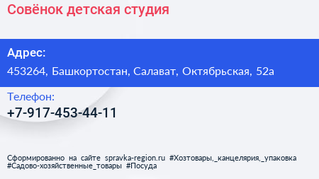 Совёнок, детская студия по адресу 453264, Башкортостан, Салават, Октябрьская, 52а в дальнейшем Организация, размещена в следующих категориях: