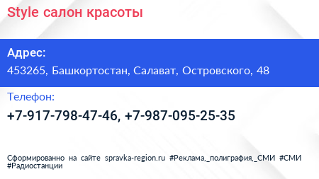 Style, салон красоты по адресу 453265, Башкортостан, Салават, Островского, 48 в дальнейшем Организация, размещена в следующих категориях: