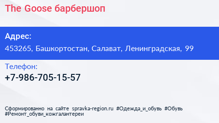 The Goose, барбершоп по адресу 453265, Башкортостан, Салават, Ленинградская, 99 в дальнейшем Организация, размещена в следующих категориях: