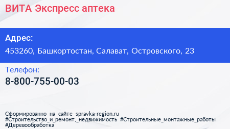 ВИТА Экспресс, аптека по адресу 453260, Башкортостан, Салават, Островского, 23 в дальнейшем Организация, размещена в следующих категориях: