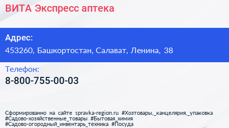 ВИТА Экспресс, аптека по адресу 453260, Башкортостан, Салават, Ленина, 38 в дальнейшем Организация, размещена в следующих категориях: