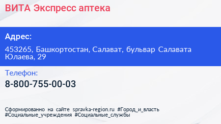 ВИТА Экспресс, аптека по адресу 453265, Башкортостан, Салават, бульвар Салавата Юлаева, 29 в дальнейшем Организация, размещена в следующих категориях: