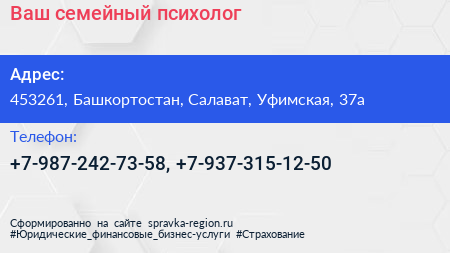 Ваш семейный психолог по адресу 453261, Башкортостан, Салават, Уфимская, 37а в дальнейшем Организация, размещена в следующих категориях: