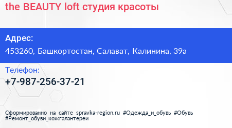 the BEAUTY loft, студия красоты по адресу 453260, Башкортостан, Салават, Калинина, 39а в дальнейшем Организация, размещена в следующих категориях: