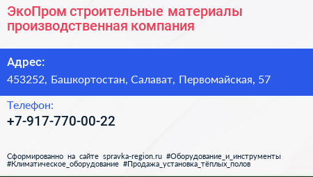 ЭкоПром-строительные материалы, производственная компания по адресу 453252, Башкортостан, Салават, Первомайская, 57 в дальнейшем Организация, размещена в следующих категориях: