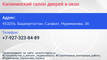 Калининский, салон дверей и окон по адресу 453256, Башкортостан, Салават, Нуриманова, 36 в дальнейшем Организация, размещена в следующих категориях:
