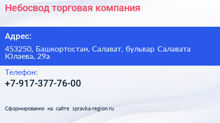 Небосвод, торговая компания по адресу 453250, Башкортостан, Салават, бульвар Салавата Юлаева, 29а в дальнейшем Организация, размещена в следующих категориях: