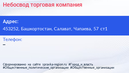 Небосвод, торговая компания по адресу 453252, Башкортостан, Салават, Чапаева, 57 ст1 в дальнейшем Организация, размещена в следующих категориях: