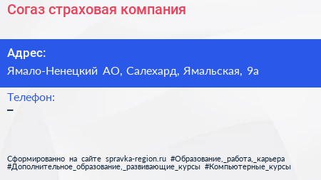 Согаз, страховая компания по адресу Ямало-Ненецкий АО, Салехард, Ямальская, 9а в дальнейшем Организация, размещена в следующих категориях: