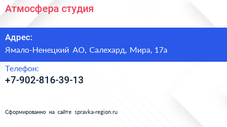 Атмосфера, студия по адресу Ямало-Ненецкий АО, Салехард, Мира, 17а в дальнейшем Организация, размещена в следующих категориях: