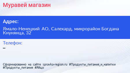 Муравей, магазин по адресу Ямало-Ненецкий АО, Салехард, микрорайон Богдана Кнунянца, 32 в дальнейшем Организация, размещена в следующих категориях: