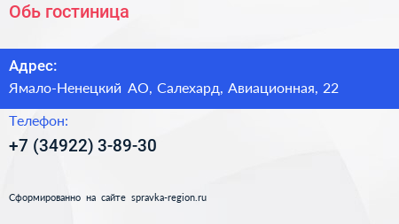 Обь, гостиница по адресу Ямало-Ненецкий АО, Салехард, Авиационная, 22 в дальнейшем Организация, размещена в следующих категориях: